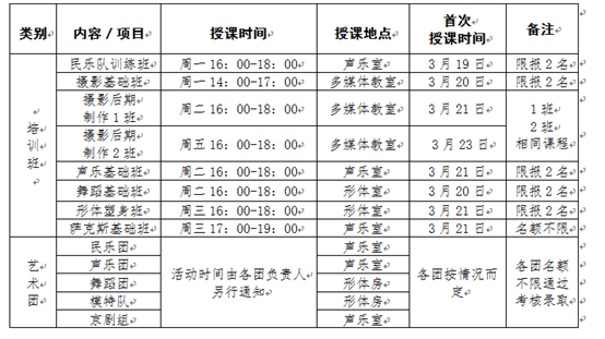 (一)培训内容:民乐队训练班、摄影基础班、摄影后期制作班、声乐基础班、舞蹈基础班、形体塑身班、萨克斯基础班。