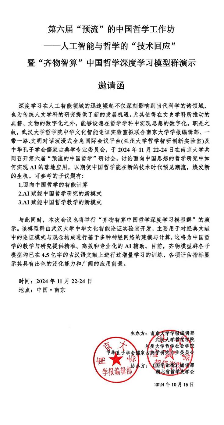 【11月22日—24日】会议邀请 | 第六届“预流”的中国哲学工作坊——人工智能与哲学的“技术回应”暨“齐物智算”中国哲学深度学习模型群演示