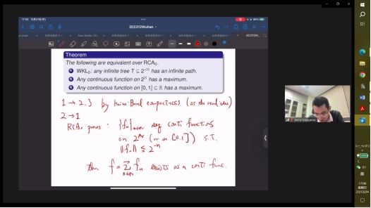 最后一部分Yokoyama教授先介绍了该领域目前研究的热门问题。比如其他更复杂的数学定理是否需要更强的公理系统?上文介绍的不同衡量强度的范畴之间有何关联?是否还有其他的衡量角度?这些问题的研究不仅需要扎实的逻辑基础,还需要对数学分支的许多领域都有所了解。Yokoyama教授也展示了他与合作者在这些问题上取得的一些成果。然后Yokoyama教授为观众演示了两个在RCA0中可证等价性命题的证明过程:WKL与极值定理的等价、,Π11CA0与艾克兰德变分原理。过程中呈现了许多反推数学中常用的方法,比如使用”fallen leaves”的概念把树结构和一个实函数对应起来。