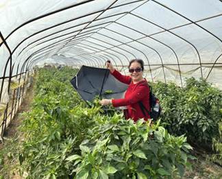 随后,大家便戴上手套,拿着袋子亲自到大棚中采摘。瓜博园中有一排排整齐排列的塑料大棚,里面种植着各种各样的瓜果蔬菜,老同志们分别采摘了茄子、南瓜、辣椒、香瓜等,在亲手采摘的过程中放松心情,享受生活,回归自然。