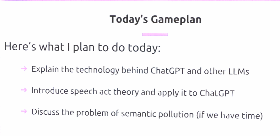 讲座伊始,Peter介绍了以ChatGPT为代表的新一代AI系统所依据的算法规则,认为新一代AI系统有着更庞大的语言模型,能够通过计算语词的使用频次、估量语词间的关系更有效地预测语言的使用。由此Peter引入了对言语行为理论的介绍。
