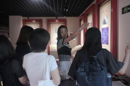 江欣苑社区以高龙文化为基础,先后引进了54个国家级、省市级非遗项目入驻园区,建成了“一坊两馆一街”:即武汉高龙城非物质文化遗产传承园百工坊和高龙博物馆、汉绣博物馆、楚香汉味一条街,是全国首家建在社区的非遗传承园。其中,作为湖北省民间传统美术,汉绣始于汉、兴于唐、盛于清,并于2008年列入国家级非物质文化遗产保护名录。汉绣博物馆作为湖北省第一家民办汉绣专题博物馆,也成为了解汉绣发展历史与现状的重要窗口。在参观汉绣博物馆的过程中,实践队员们欣赏到了琳琅满目的汉绣艺术作品,这些作品构思精巧、技法独特、色彩浓艳、纹样精美,体现出强烈的传统与现代融合之感。而汉绣线上数字展馆更让实践队员们深刻感受到了数字化时代汉绣非遗文化迸发的强大生机与活力。